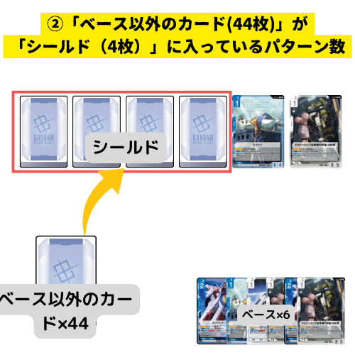 「デッキのベース以外(44枚)」が「ベース以外のシールド(4枚)」に選ばれるパターン数は「135,751」