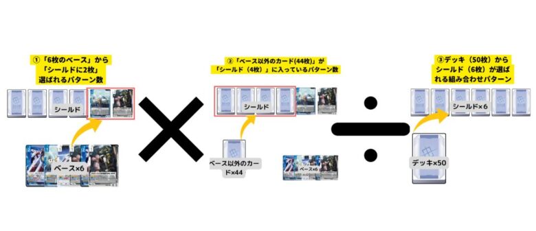 ベースからシールドに選び出されるパターン数×非ベースのカードがシールドに選び出されるパターン数÷デッキからシールドが選ばれるパターン数