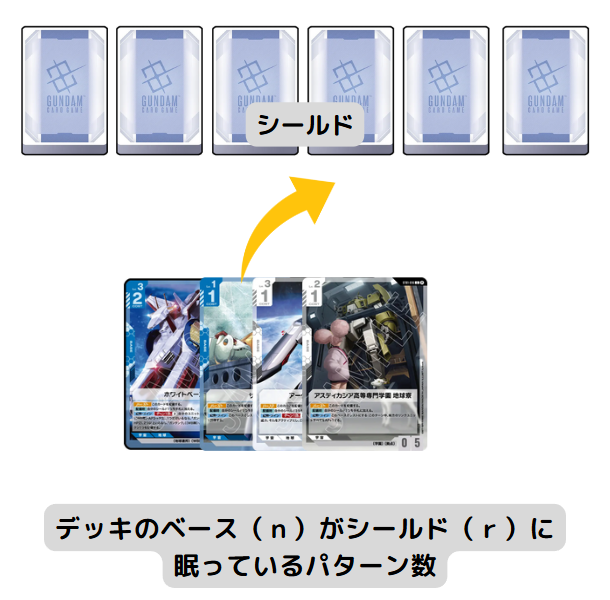 この記事ではこの「nCr」を多用して「ベース枚数とシールドに埋まっている確率」を計算していきます。