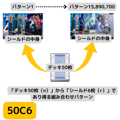 ガンダムカードゲームは「デッキ枚数50枚固定」かつ「初期シールド6枚」なので、ここは「50C6」=「15,890,700」で確定です。