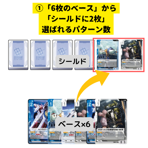 「デッキのベース(6枚)」が「シールド(2枚)」に選ばれるパターン数は「15」