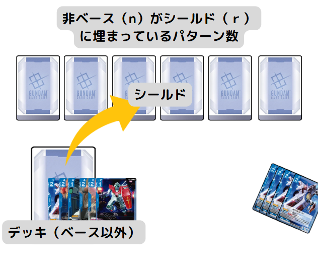 今回は「デッキ内の6枚のベース」が「シールドに2枚」埋まっている確率を計算していきます。