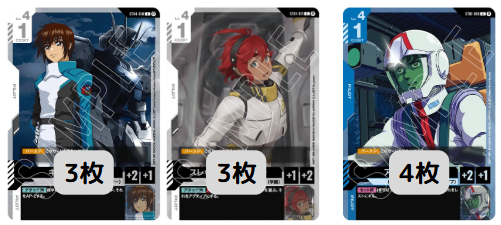 「どれに乗せても強い」非常に優秀なパイロットカードなのですが、後述の『スレッタ』も捨てがたいので3枚にして調節しています。